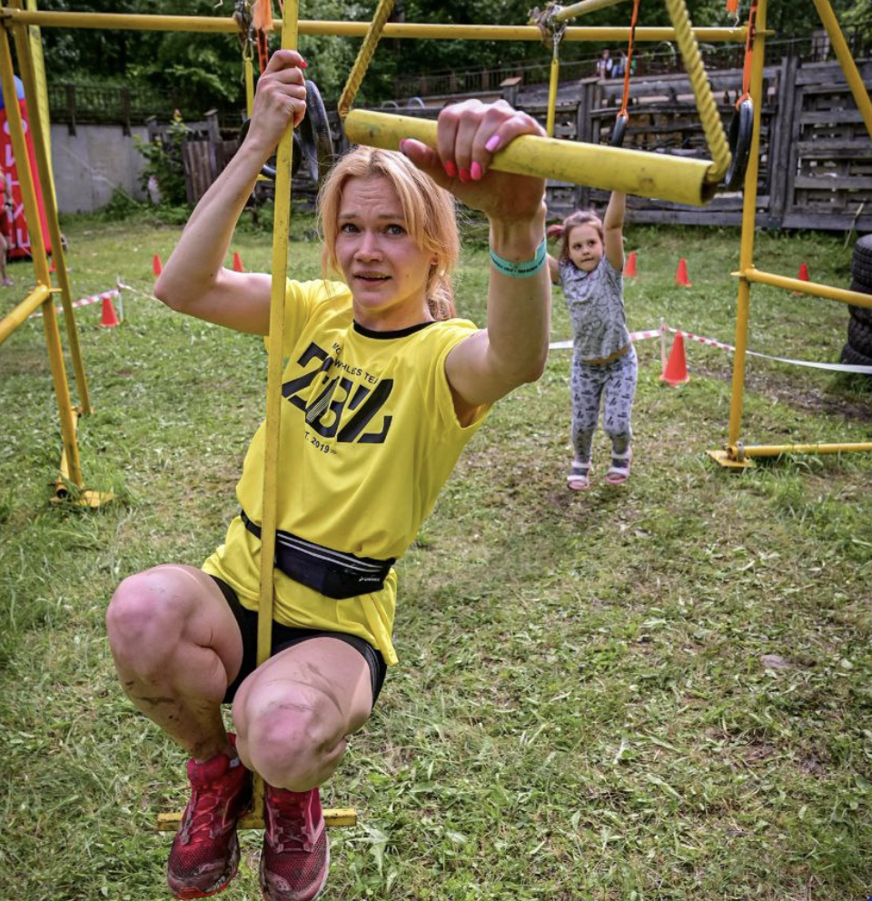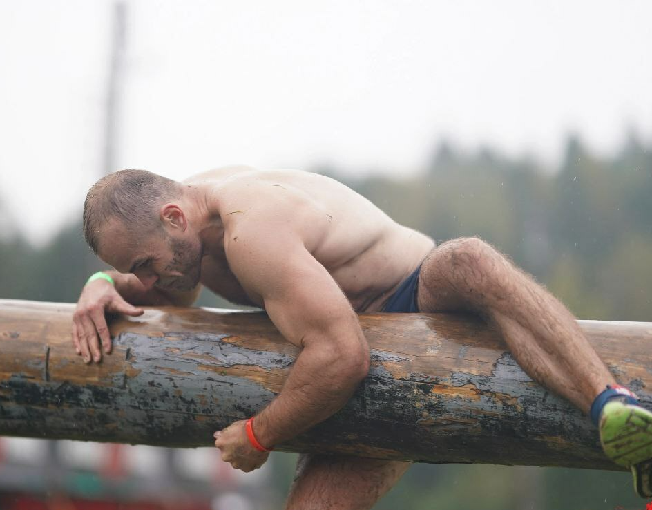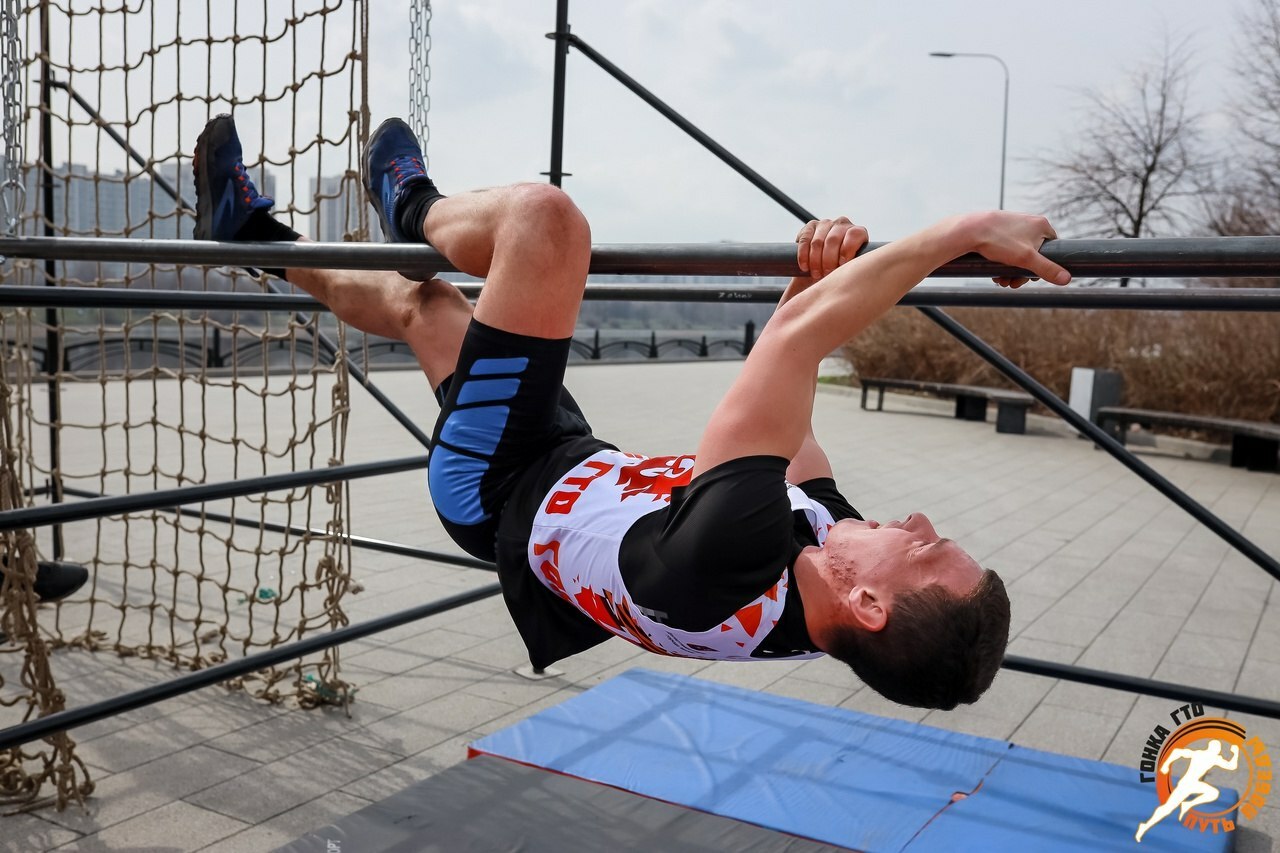 Задача: каждый участник берет гирю и ведет её по канату, продетому в препятствия, до конца. После отстегивает карабин и ставит гирю на место