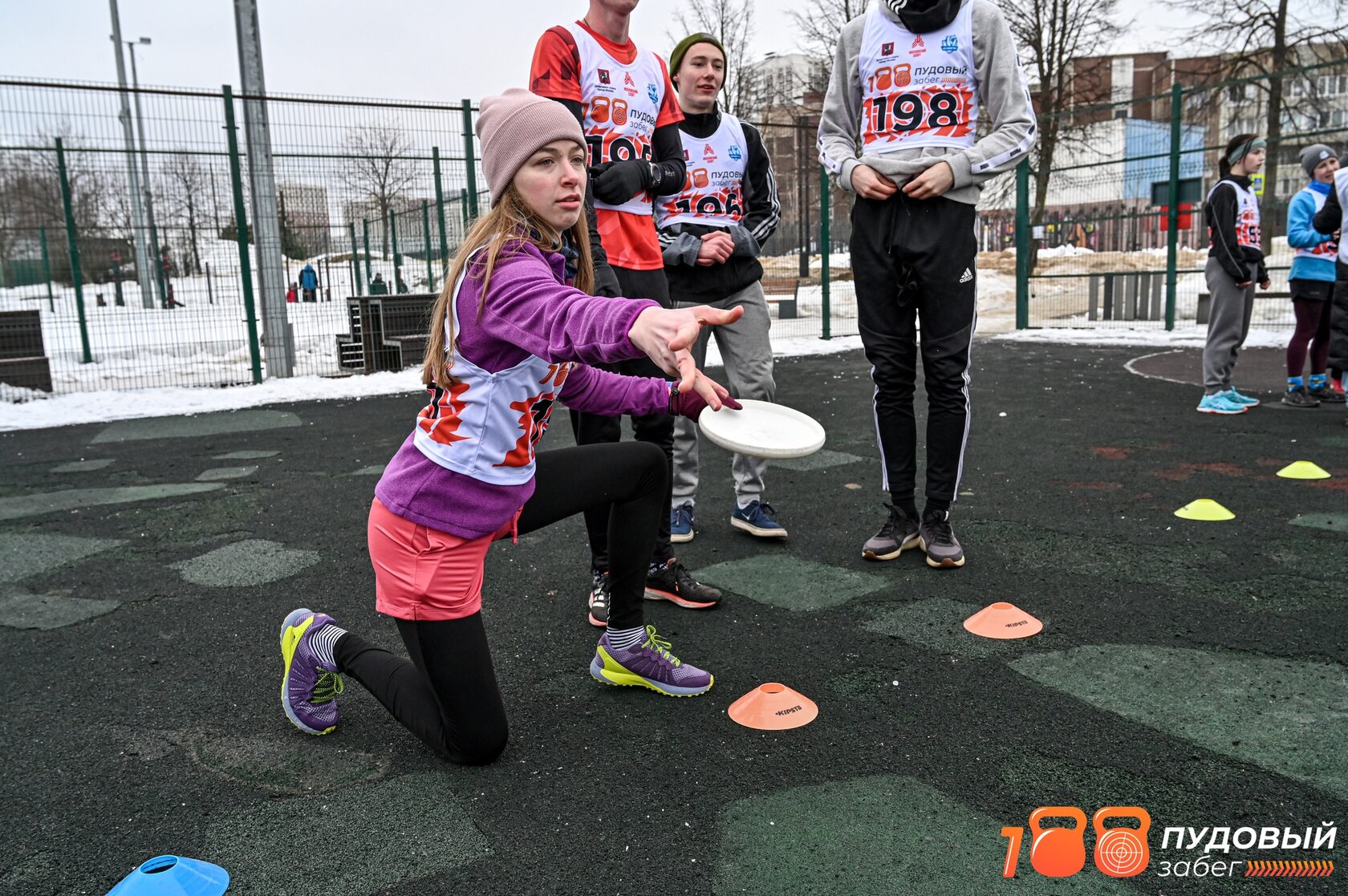 Задача: каждый участник бросает фрисби в ворота 5 раз. Необходимо попасть 4 раза. Попадание = более половины фрисби залетело за линию ворот. В случае попадания 3 раза и меньше - 1 НЕДОпопадание переводится в 30 штрафных приседаний с гирей Гири: для Мужчин - 16 кг, для Девушек - 8 кг Гирю держим КАК УГОДНО. Присед момента, когда бёдра параллельны земле.