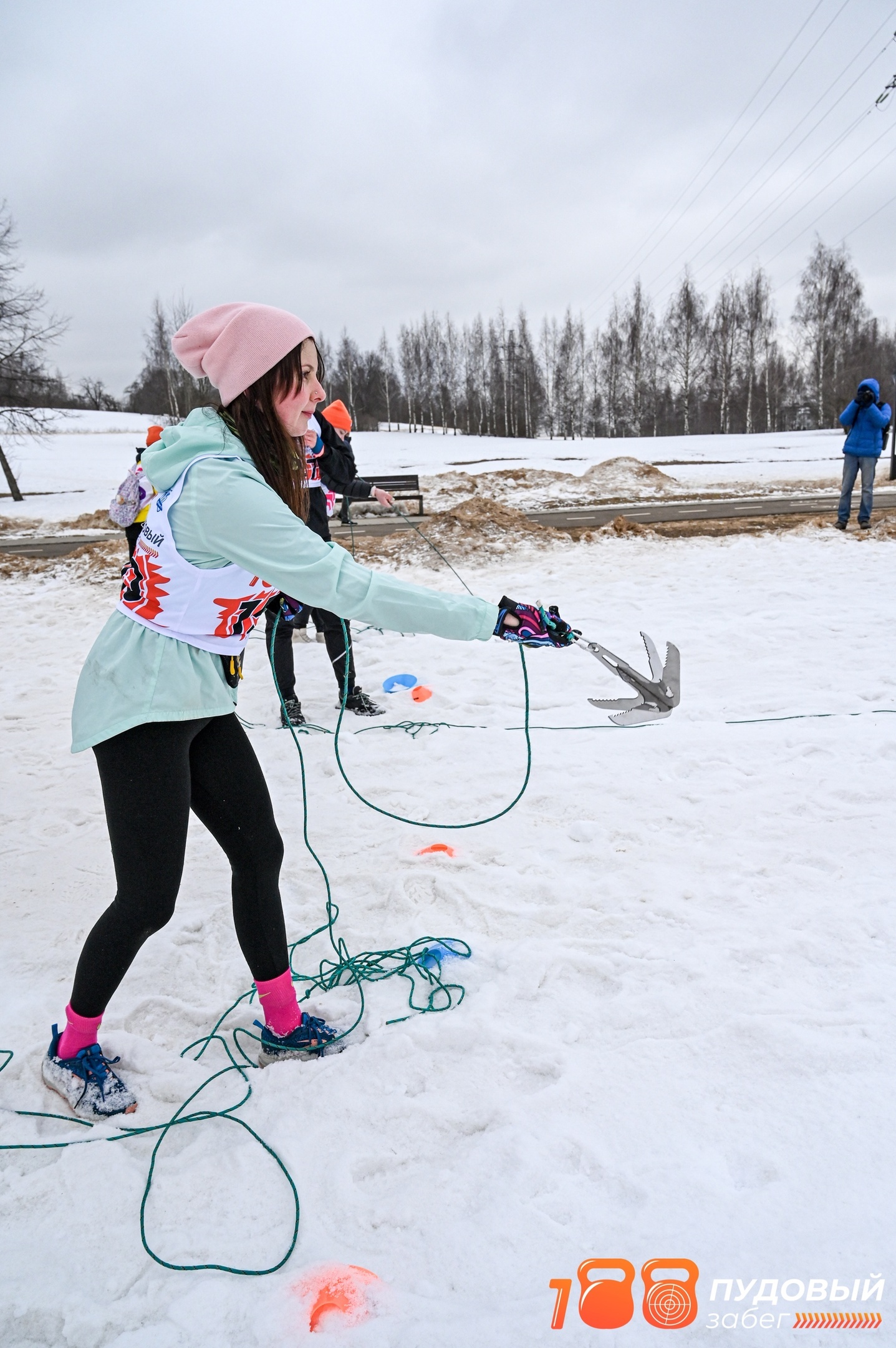 Задача: каждый участник бросает кошку, чтобы зацепить покрышку и подтащить к себе до касания рукой/ногой. Если покрышка сорвалась на пути - не зачет. У каждого участника 5 попыток, из которых необходимо зацепить+подтащить покрышку 4 раза. В случае попадания 3 раза и меньше - 1 НЕДОпопадание переводится в 30 штрафных махов гирей до параллели перед собой. Гири: для Мужчин - 16 кг, для Девушек - 8 кг